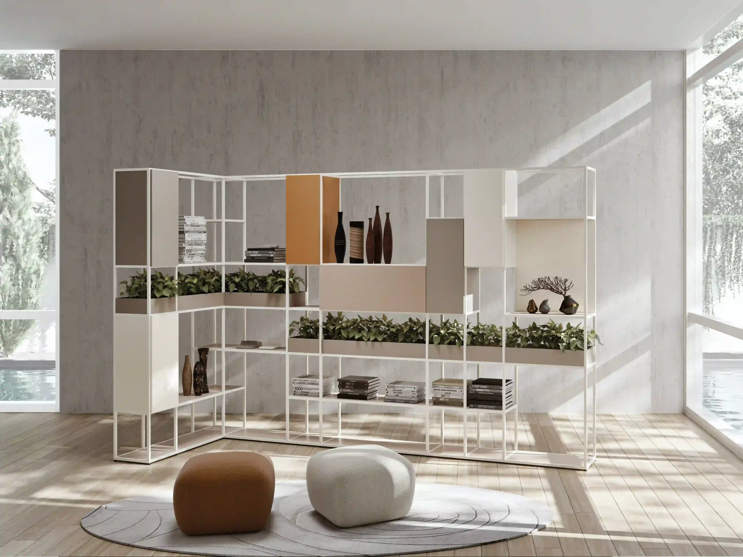 Pri modulih lahko izbirate med 8 različnimi širinami, 3 globinami in 2 višinama. Hrbet in stranice je mogoče nadomestiti z jeklenimi veznimi palicami, ki podpirajo konstrukcijo in ponujajo estetsko alternativo.